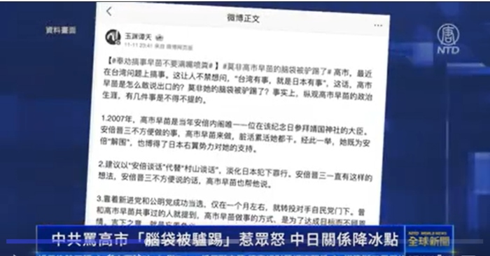 Một ngày trước đó, cơ quan ngôn luận của ĐCSTQ – CCTV, đã đăng một bài viết trên tài khoản công chúng WeChat “Ngọc Uyên Đàm Thiên” (玉淵潭天) (https://news.cctv.com/special/yuyuantantian), chửi rủa thậm tệ Thủ tướng Nhật Bản “gây chuyện” trong vấn đề Đài Loan, thậm chí còn gọi bà Takaichi Sanae là “Tảo Miêu gây chuyện”. Bài viết thậm chí còn viết một cách cực kỳ thô bỉ: “Phải chăng não của bà ta bị lừa đá rồi?”