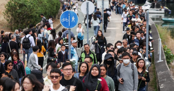Kể từ khi vụ hỏa hoạn gây chấn động xảy ra, mỗi ngày đều có hàng chục ngàn người đổ về đây để chia buồn và tưởng niệm. Trong số 8 tòa nhà cao 31 tầng tại khu Hoành Phúc Uyển (Wang Fuk Court), có tới 7 tòa bị ngọn lửa tàn phá, khiến gần 2.000 gia đình mất nhà cửa. Giờ đây, hiện trường chỉ còn lại những bộ khung khổng lồ của các tòa nhà, một số khu vực vẫn còn bao quanh bởi giàn giáo tre cháy dở và những mảnh lưới bảo hộ rách nát bay trong gió.