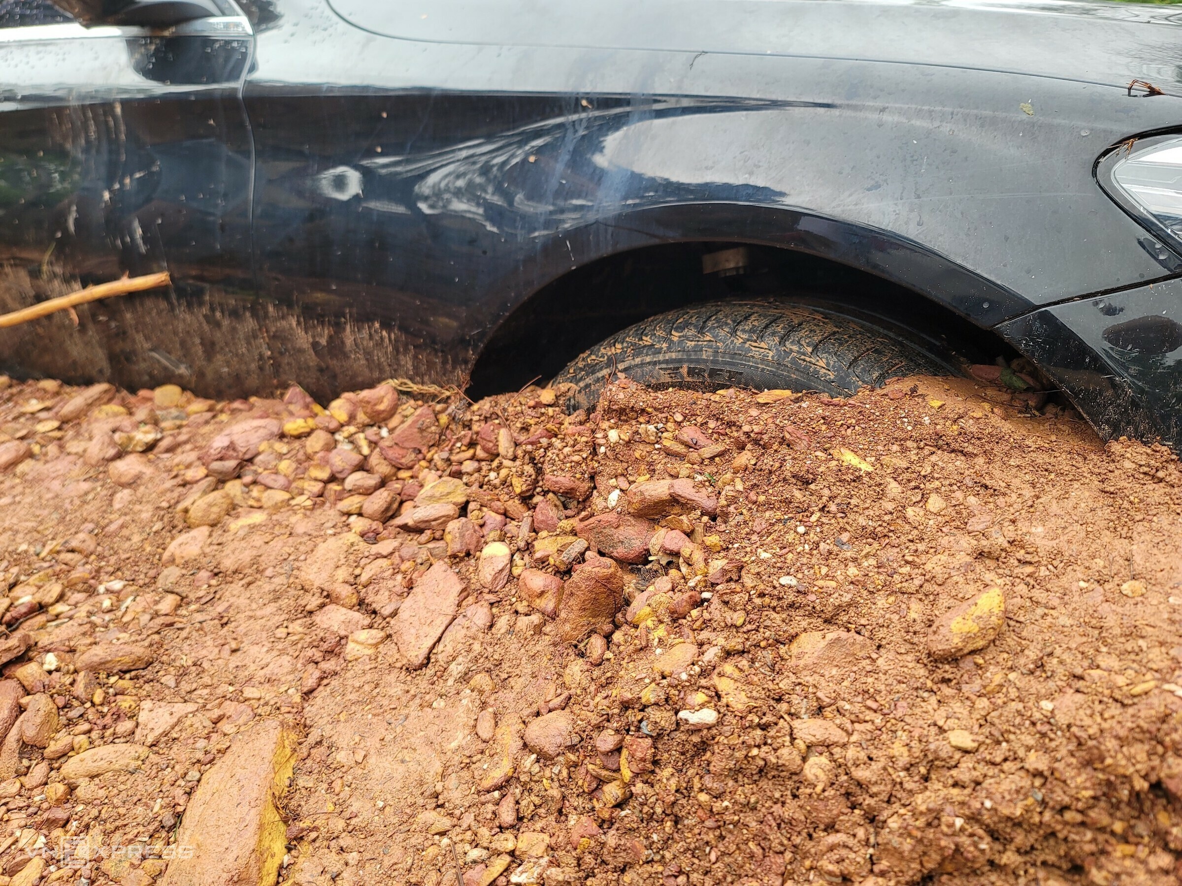 Lũ quét từ trên đồi cao tràn xuống con đường bêtông ở xã Minh Phú, huyện Sóc Sơn, vùi và làm hư hại 13 ôtô của du khách, sáng 4/8.