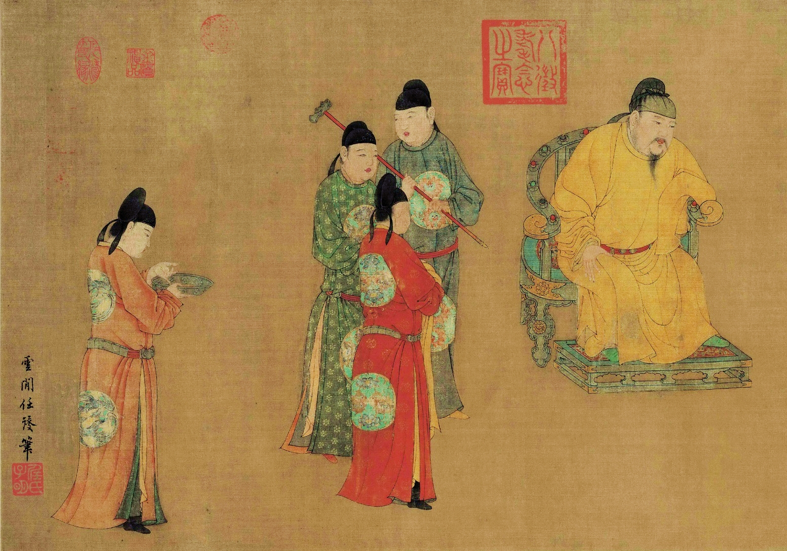 Cao Lực Sĩ hỏi Đường Huyền Tông có thấy không khỏe không, ông mỉm cười đáp: “Không”, rồi kể lại giấc mơ đêm qua được du ngoạn đến Nguyệt Cung, nghe tiếng nhạc du dương, khiến ông vô cùng thích thú. Bức tranh “Trương Quốc gặp Hoàng đế Minh Hoàng” (chi tiết) của Nhâm Nhân Phát thời nhà Nguyên. (Thuộc phạm vi công cộng)