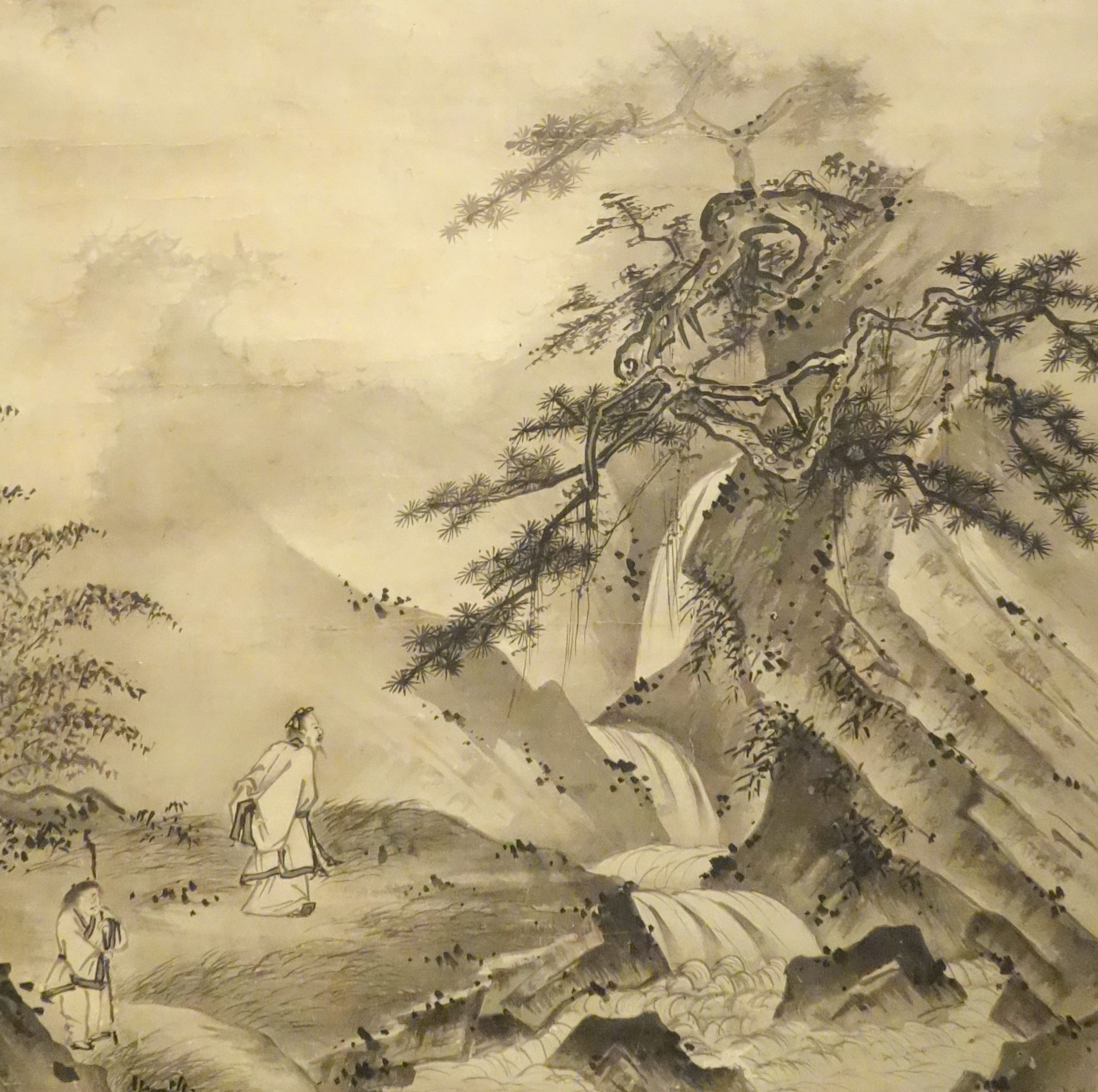 Lý Bạch, “Vọng Lư Sơn bộc bố thủy”: “Phi châu tán khinh hà, lưu mạt phí khung thạch. Nhi ngã lạc danh sơn, đối chi tâm ích nhàn. Vô luận thấu quỳnh dịch, hoàn đắc tẩy trần nhan. Thả hài túc sở hảo, vĩnh nguyện từ nhân gian.” (Tạm dịch: Hạt châu bay tan thành ráng khói nhẹ, bọt nước chảy sôi trên đá lớn. Mà ta yêu núi danh, đối diện lòng thêm nhàn. Chẳng cần súc miệng bằng rượu tiên, cũng đủ rửa sạch mặt bụi trần. Hãy làm vui lòng sở thích bấy lâu, nguyện vĩnh viễn từ giã cõi nhân gian.) (Trích đoạn trục tranh “Lư Sơn quan bộc” (Ngắm thác Lư Sơn) của Lâm Thư thời Dân Quốc – Bảo tàng Cố cung Quốc gia cung cấp)